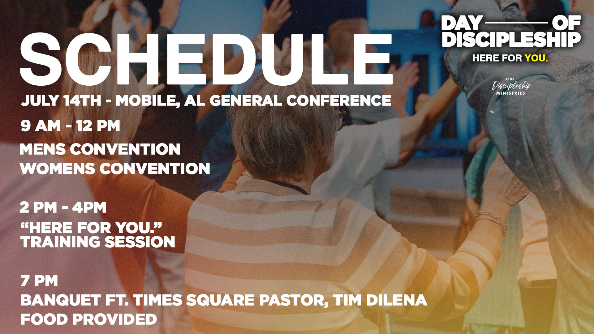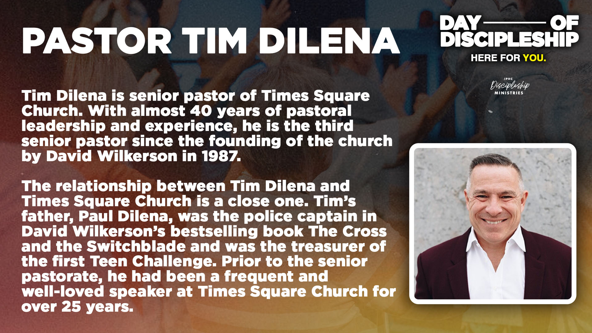 The day will conclude with an evening meal hosted by the Discipleship Ministries team. Following our dinner, our guest speaker, Pastor Tim Dilena from Times Square Church, will bring a timely message of encouragement to strengthen you for ministry. Our hope is to create a sense of home, a place where leaders can pause, connect, share stories, and be encouraged by what God is doing across the IPHC.