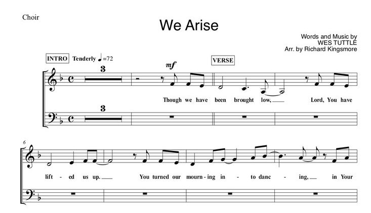 Tuttle and Kingsmore have made “We Arise” and the resources of chord charts, choir parts, accompaniment, and much more available for churches via Kingsmore’s site https://www.richardkingsmore.com/choral